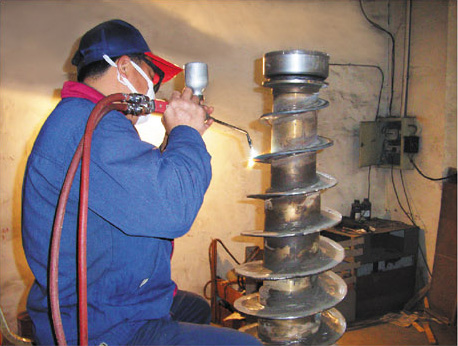 6、關(guān)鍵部位防腐、耐磨。螺旋推料面、螺旋體進(jìn)料分布部位及轉(zhuǎn)鼓出渣口等關(guān)鍵部位一般均噴焊或堆焊硬質(zhì)合金耐磨層,特殊用途離心機(jī)則 采用鑲片式硬質(zhì)合金耐磨塊或鑲耐磨套或貼耐磨陶瓷片,防腐、耐磨、使用壽命長(zhǎng)。